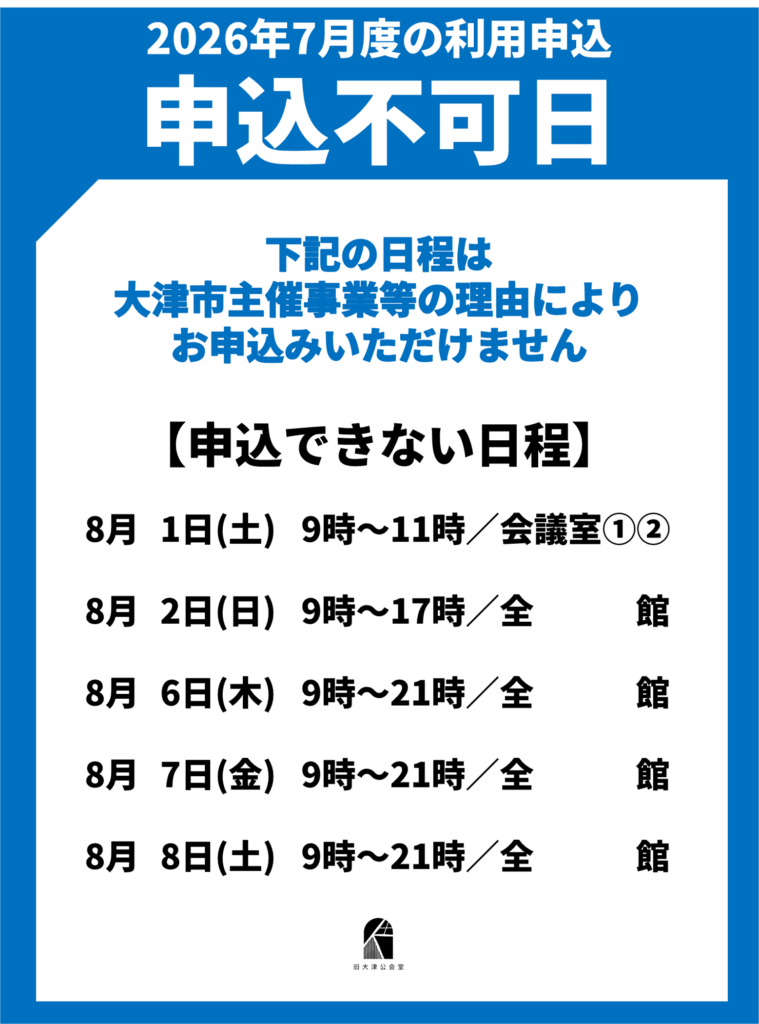 2026.01.31 NEWS 2026年8月度の申込不可日程 平素は旧大津公会堂をご愛顧いただき、誠にありがとうございます。 2月1日より2026年8月度の受付を開始いたします。 大津市主催事業により、以下の日程はお申込みいただけませんのであらかじめご了承ください 2026年8月度の受付は2月1日の午前9時より来館された方から先着優先で実施いたします。 午前11時からはお電話での受付を行いますが、仮予約となりますので1週間以内にご来館のうえお手続きください。 ※1週間以内にご来館によるお手続きがない場合は自動的にキャンセルとなります。