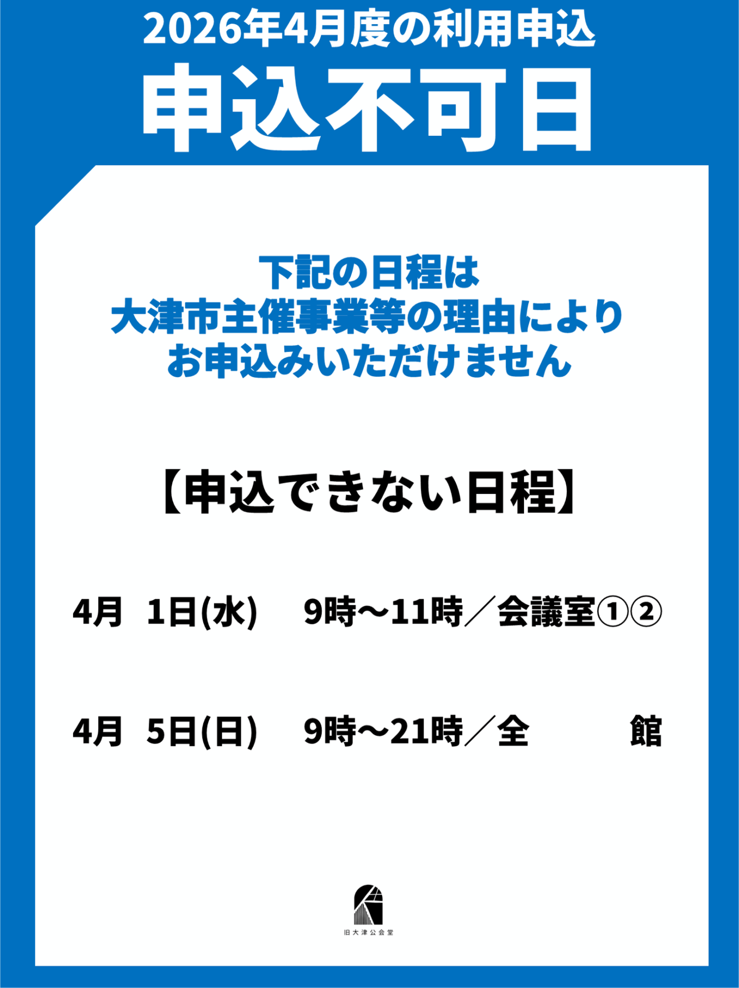 2025年09月25日 NEWS 2026年4月度の申込不可日程 平素は旧大津公会堂をご愛顧いただき、誠にありがとうございます。 10月1日より2026年4月度の受付を開始いたします。 大津市主催事業により、以下の日程はお申込みいただけませんのであらかじめご了承くだ… 続きを読む
